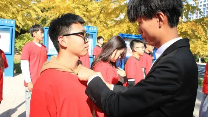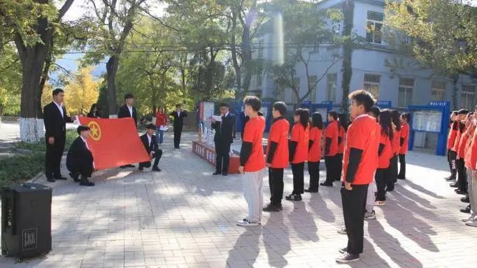 四名護旗手手持團旗緩緩走向隊伍前方。新團員面向鮮艷的團旗,高舉右拳莊嚴宣誓:“我志愿加入中國共產主義青年團,堅決擁護中國共產黨的領導,遵守團的章程,執行團的決議,履行團員義務,嚴守團的紀律,勤奮學習,積極工作,吃苦在前,享受在后,為共產主義事業而奮斗!”