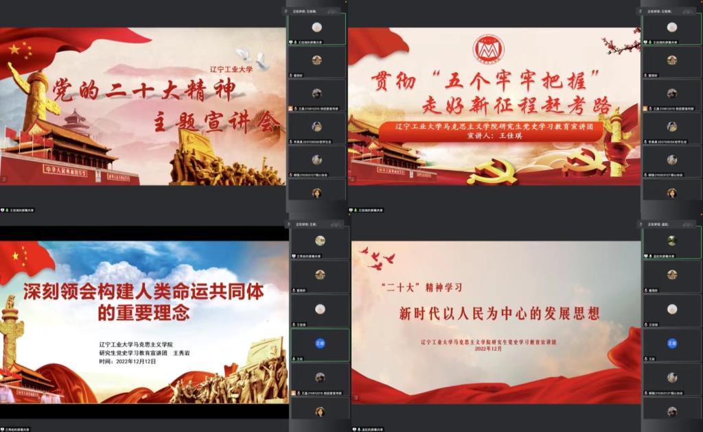 為深入學習貫徹黨的二十大精神,深刻領悟“兩個確立”的決定性意義,不斷增強“四個意識”、堅定“四個自信”、做到 “兩個維護”,引領廣大青年更加緊密地團結在以習近平同志為核心的黨中央周圍,不斷用習近平新時代中國特色社會主義思想武裝青年、教育青年,深入學習和領會黨的二十大精神的豐富內涵和核心要義,由校團委精心組織,我校馬克思 主義學院研究生紅色理論宣講團分別于12月11日、12月12日和12月13日面向馬克思主義學院全體研究生、校級學生會與學生社團管理部等校級學生組織工作人員、學院學生會工作人員與班級團支部委員等共計500余人在線上開展“黨的二十大精神”主題宣講活動。